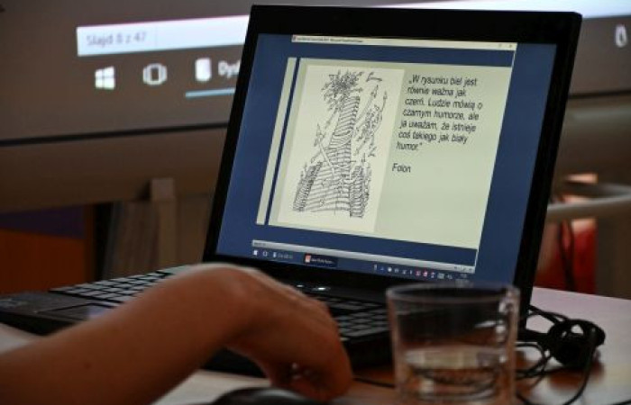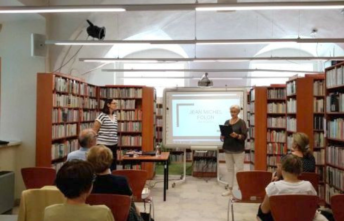 Nasza gościni przybliżyła zebranym słuchaczom sylwetkę, biografię i twórczość Jeana Michela Folona, urodzonego w 1934 roku artysty belgijskiego, wizjonera codzienności. Po studiach architektonicznych Folon rozpoczął edukację na wydziale wzornictwa przemysłowego – to wtedy oddał się pracom malarskim. Wyemigrował do Francji i próbował publikować swoje rysunki – szkice ilustrujące aktualności – w prasie, jednak jego prace zyskały popularność i uznanie dopiero w Stanach Zjednoczonych. Bardzo duże zainteresowanie jego szkicami wykazały tak cenione czasopisma, jak New Yorker, The New York Times czy Esquire. W latach 60. zapoznał się z Saulem Steinbergiem, ilustratorem i karykaturzystą: artyści zaprzyjaźnili się, współpracowali ze sobą i mieli wzajemny wpływ na swoją twórczość. Od lat 60. prace Folona były coraz częściej wystawiane w galeriach – w 2005 roku we Florencji odbyła się jego największa i jedna z ostatnich wystaw, część prac została przekazana miastu. Od roku 1965 Folon zaczął interesować się kolorem, a w latach 70. artysta, wcześniej skoncentrowany na rysunkach tuszem, zaczął malować akwarele. Na jego obrazach bardzo często przewijają się motywy podróży, statków, motywy zwierzęce i figury ludzkie. Bardzo istotne w twórczości Folona jest podejście do kontrastu miasta/natury. Twórca ilustrował codzienność człowieka w mieście, przedstawiał jednostkę w tłumie, jej anonimowość i brak indywidualności jednocześnie. Przedstawiał tym samym oderwanie człowieka od jego naturalnego środowiska i „wchłonięcie” przez miasto. Folon był przy tym czynnym aktywistą na rzecz ochrony środowiska – współpracował między innymi z Greenpeace. Znajomość z Jacquesem Marquetem zapoczątkowała w twórczości Folona okres sitodruku – były to dzieła mniej oszczędne w środkach niż akwarele, jednocześnie o bardzo intensywnym wyrazie. Pod koniec 1989 roku Folon zaczął tworzyć rzeźby – zazwyczaj postaci ludzkich – które były umiejscawiane w przestrzeniach miejskich (między innymi w Brukseli). Folon lubił podejmować dialog z widzem, przywiązywał jako plakacista dużą wagę do spojrzenia. Jako wybitny twórca plakatów cechował się zdolnością szybkiej komunikacji z widzem. Folon zmarł w 2005 roku w wieku 71 lat. W 90. urodziny Folona odbył się konkurs o tematyce „między marzeniem a rzeczywistością”, na który napłynęło aż 400 prac nawiązujących do twórczości artysty.