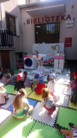 Czy kąpiel, mycie zębów, robienie i wieszanie prania można zamienić w zabawę? Dzięki naszym dzisiejszym gościom mieliśmy okazję przekonać się, że jest to możliwe. Panie Natalia Sacharczuk i Katarzyna Staniewska zaprezentowały naszym najmłodszym czytelnikom, spektakl pt. „Łazienkowe fiku-miku”. Założeniem przedstawienia było nie tylko dobra zabawa, ale przede wszystkim stymulacja wzroku, słuchu, poczucia rytmu i dotyku, a także rozwijanie dziecięcej kreatywności i wyobraźni.