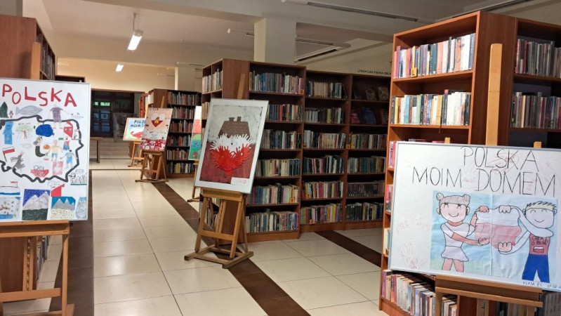 Fragment wystawy "Polska moim domem" w bibliotece
