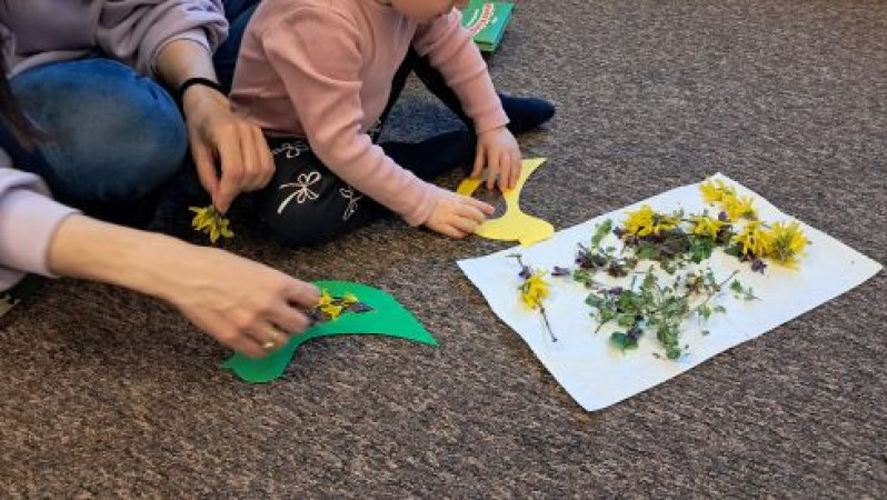 Dziecko wraz z opiekunek tworzy pracę plastyczną z suszonych kwiatów