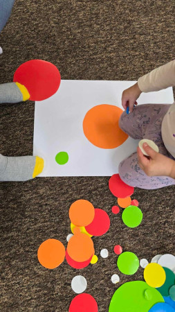Dziecko nakleja kolorowe koła na białą kartkę papieru