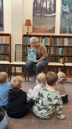 Bibliotekarka pokazuje dzieciom okładkę książki