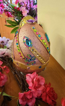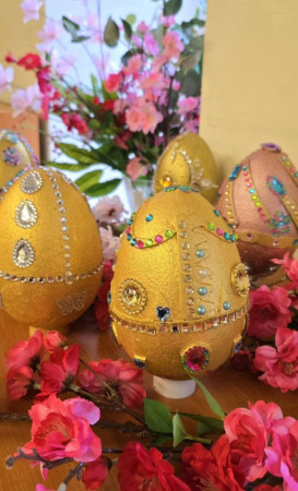 Ręcznie wykonane jajo wielkanocne, zdobione diamencikami, ze złotymi akcentami