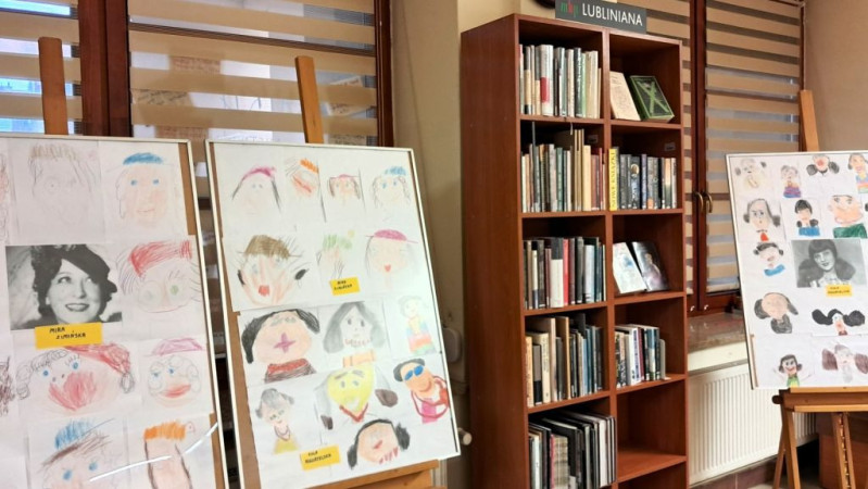 Portrety kobiece namalowane przez dzieci - na pierwszym planie wizerunki Miry Zimińskiej