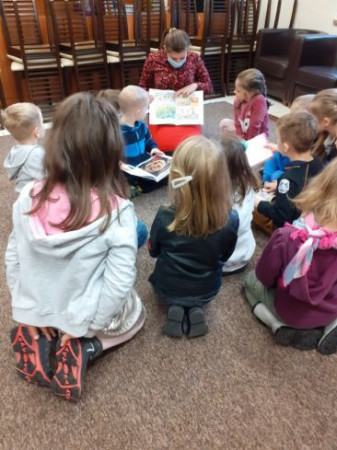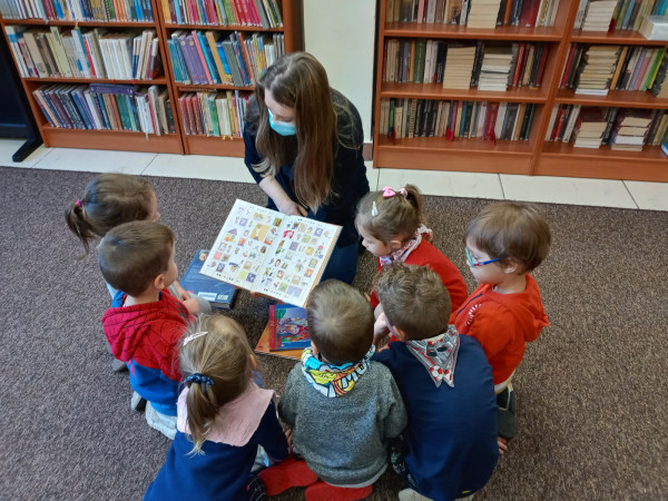Kobieta i grupa dzieci siedzi na dywanie i pokazuje ilustracje w książce