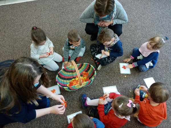 Grupka dzieci siedzi na dywanie i, po środku stoi kosz z liśćmi