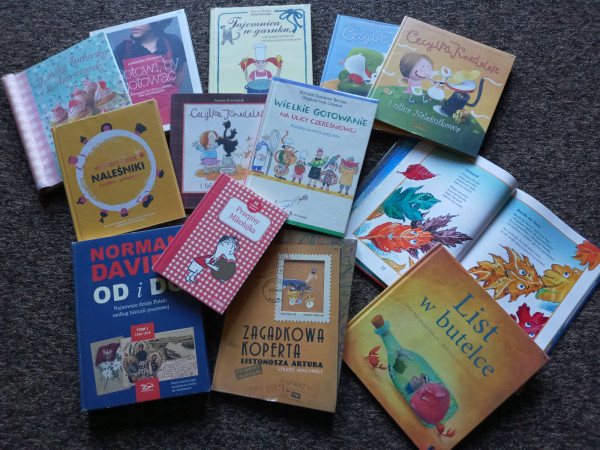 Na wykładzinie ułożone ksiązki dla dzieci poświęcone gotowaniu