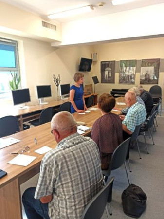 Grupa seniorów podczas zajęć - przed nimi notatki