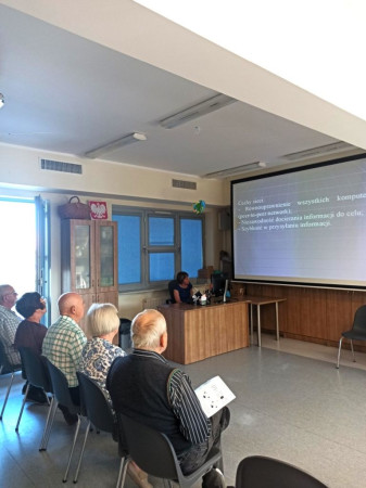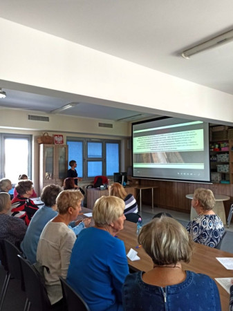 Seniorzy oglądają prezentację poświęconą zagadnieniom językowym