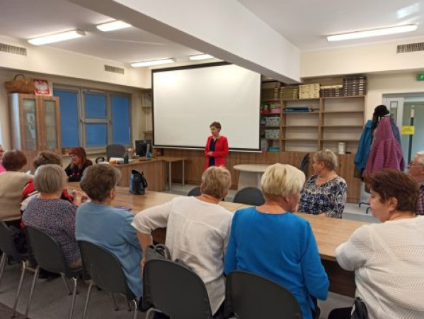Bibliotekarka rozmawia ze zgromadzonymi w bibliotece seniorami