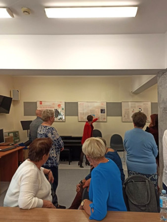 Bibliotekarka prezentuje seniorom wystawę eksponowaną w filii