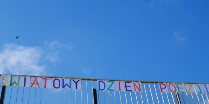 Na tle błękitnego nieba kolorowe litery układające się w napis Światowy Dzień Poezji