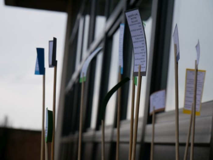 Przed oszklonym wejściem do biblioteki postać kobieca czytająca fragmenty wierszy przymocowane do patyków wetkniętych w kwiatowy gazon