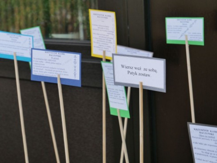 Na patykach barwne kartoniki z fragmentami wierszy Baczyńskiego