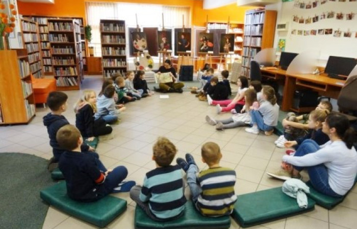 Filia 34 zaprosiła pierwszą klasę Szkoły Podstawowej nr 50 na spotkanie z książką Petera Carnavasa „O chłopcu, który wpadł do ksiązki”.