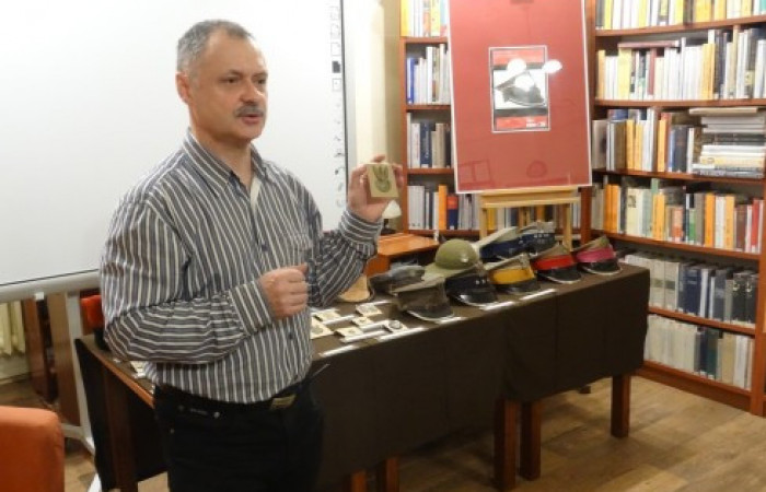 Najbardziej znane formacje wojskowe z ich charakterystycznymi czapkami, hełmami i całym żołnierskim umundurowaniem omówił Grzegorz Sztal podczas spotkania z młodzieżą 21 listopada 2019 r. w Filii nr 21.