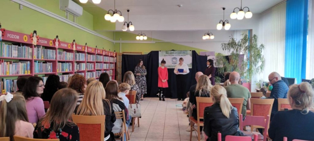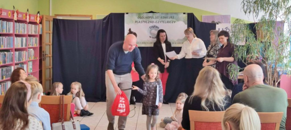 Kobiety stoją przed publicznością, w tle tytuł "Ogólnopolski Konkurs Plastyczno-Czytelniczy"