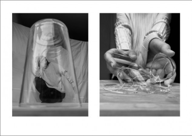 Aleksandra Marzęta [na zdjęciu po lewej stronie postać zamknięta w szklance, na zdjęciu po prawej stronie dłonie trzymające rozbite szkło]