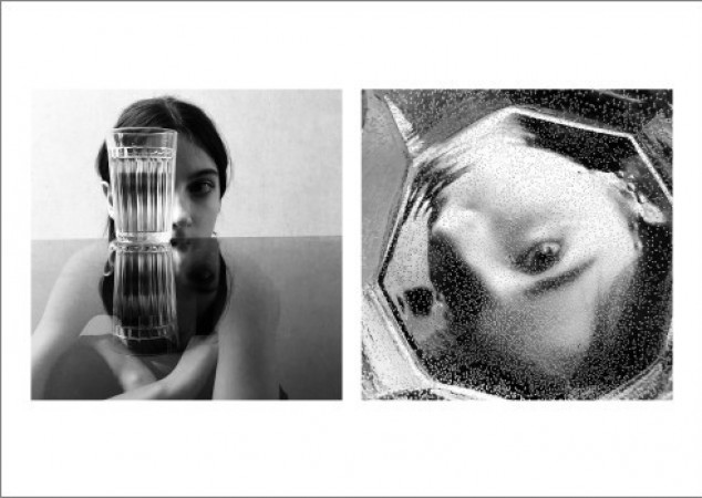 Anastasia Bai - [na zdjęciu po lewej stronie twarz ]młodej kobiety widziana przez szklankę; na zdjęciu po prawej ta sama twarz pokazywana przez pryzmat dna szklanki