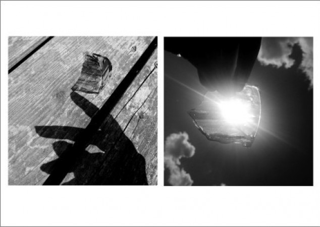 Anna Korol - [na zdjęciu po lewej stronie szkło] leżące na desce i cień dłoni; na zdjęciu po prawej stronie palce trzymające szkło pod słońce