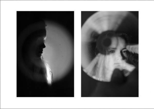Karolina Kołudzka - [na dwóch fotografiach portret dziewczyny widzianej przez nieostry otwór płyty CD oraz jej twarz odbijająca się w błyszczącej powierzchni płyty CD]