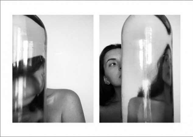 Katarzyna Solarska - [na dwóch fotografiach, wizerunek młodej kobiety przez pryzmat przezroczystej szklanej butelki]