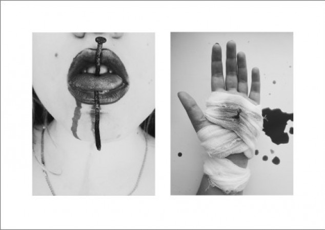 Maryia Bohush - [na zdjęciu po lewej stronie otwarte usta i język przebity gwoździem; na zdjęciu po prawej stronie ręka obandażowana i przebita gwoździem]