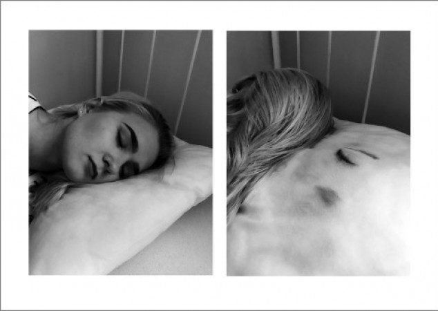 Natalia Sander - [na dwóch fotografiach głowa dziewczyny na poduszce i poduszka z odciśniętym wizerunkiem twarzy]