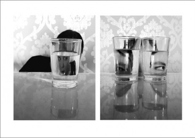 Palina Azimka - [na dwóch fotografiach czarna sylwetka głowy widziana przez pryzmat szklanki na tle wzoru tapety oraz dwie szklanki z wodą odbijającą oczy]