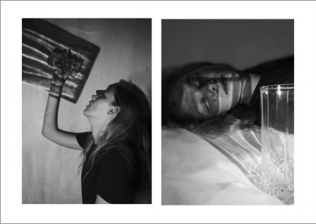 Valeriia Malashevska - [na zdjęciu po prawej stronie sylwetka pochylonej dziewczyny i duży cień szklanki na ścianie, na zdjęciu po prawej stronie cień szklanki na twarzy leżącej dziewczyny]