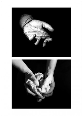 Magdalena Korona - [na górnym zdjęciu obandażowana ręka wyłaniająca się z czerni; na zdjęciu dolnym dłonie trzymające bandaż]