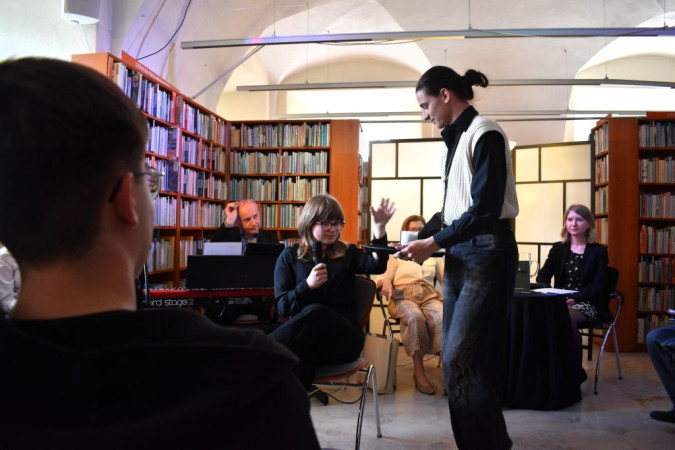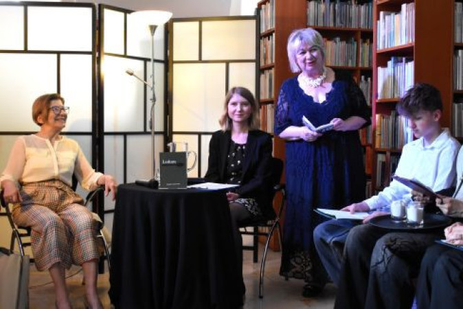 Fragment spotkania autorskiego - aktor Teatru Panopticum odczytuje wiersz poetki