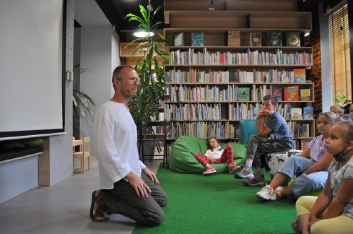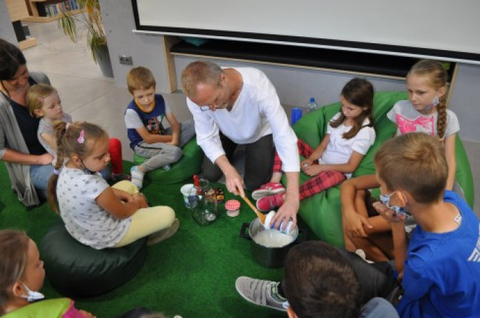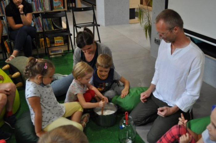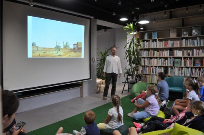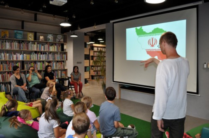 "Bah bah. Iran dla dociekliwych" to najnowsza książka Wydawnictwa Dwie Siostry z serii Świat dla dociekliwych. Jej autorem jest Albert Kwiatkowski, który 17 sierpnia był gościem Bioteki. Na spotkaniu z dziećmi opowiedział o kulturze, sztuce, tradycjach Iranu i jego położeniu geograficznym. Opowieściom towarzyszyła prezentacja zdjęć. Niespodzianką wieńczącą spotkanie było wspólne przygotowanie tradycyjnego irańskiego napoju, który wszystkim smakował.