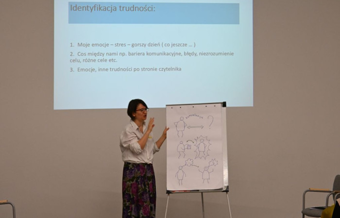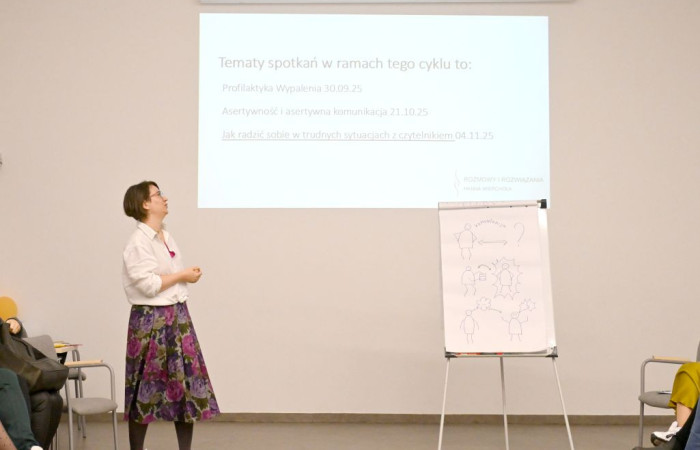 Podczas szkolenia bibliotekarze poznali techniki skutecznej i asertywnej komunikacji, uczyli się rozpoznawać własne emocje i reagować na nie w sposób konstruktywny. W bezpiecznej i wspierającej atmosferze mieli okazję dzielić się swoimi doświadczeniami, omawiać realne sytuacje z codziennej pracy oraz wspólnie poszukiwać rozwiązań.