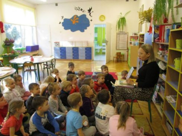 Wnętrze przedszkola: bibliotekarka siedzi wśród dzieci