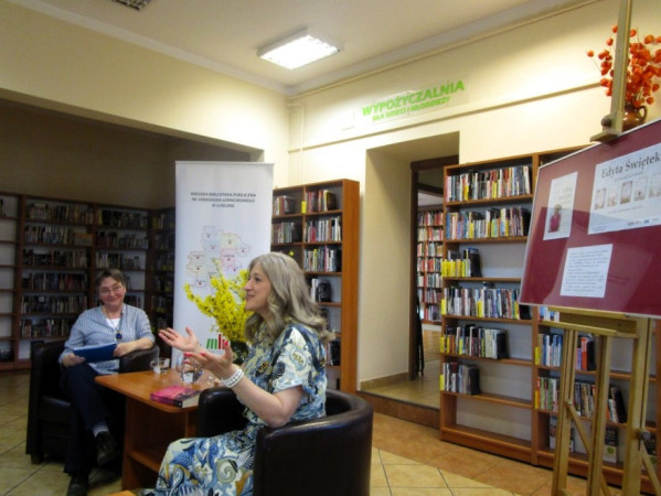 Fragment spotkania z Edytą Świętek - autorka i prowadząca przed zgromadzonymi gośćmi