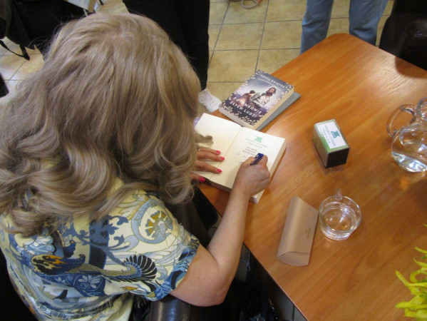 Autorka rozmawia z czytelnikami i podpisuje książki podczas spotkania autorskiego