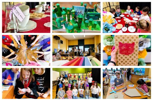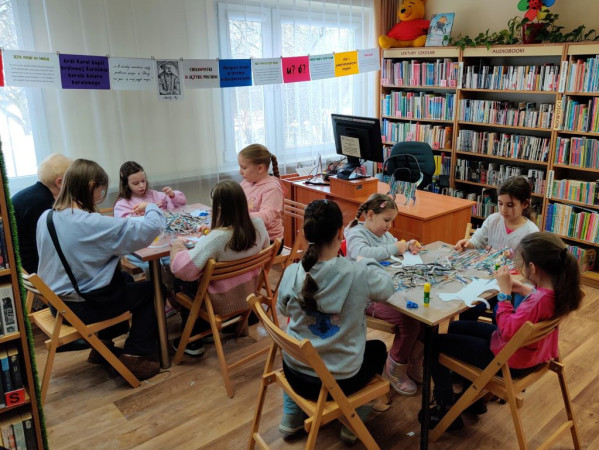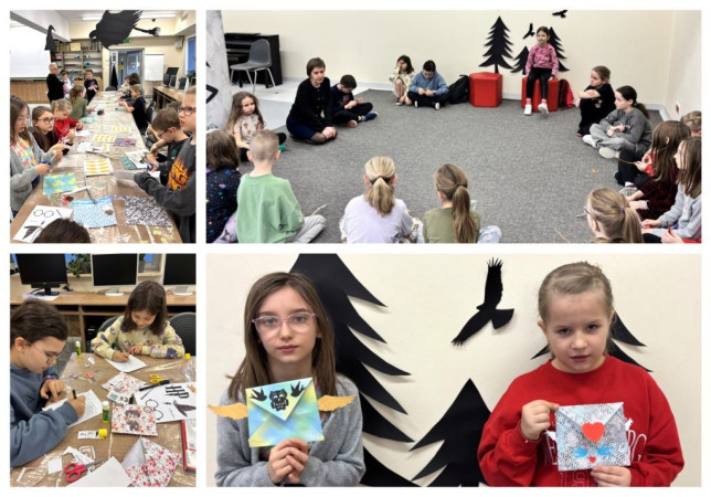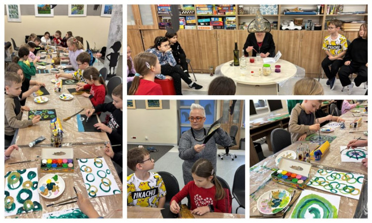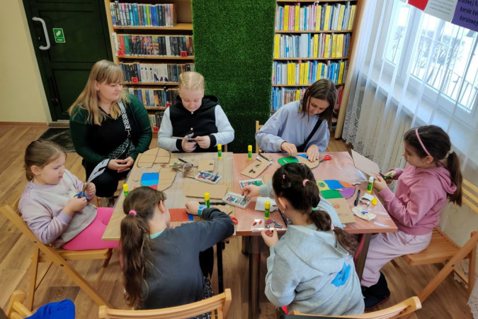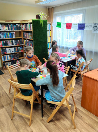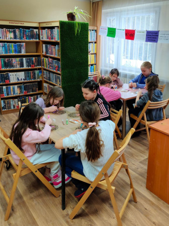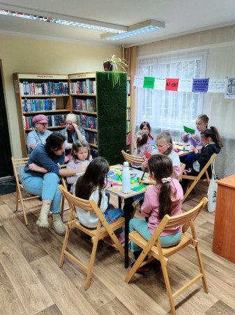 Dzieci tworzą prace plastyczne w bibliotece, towarzyszą im osoby dorosłe