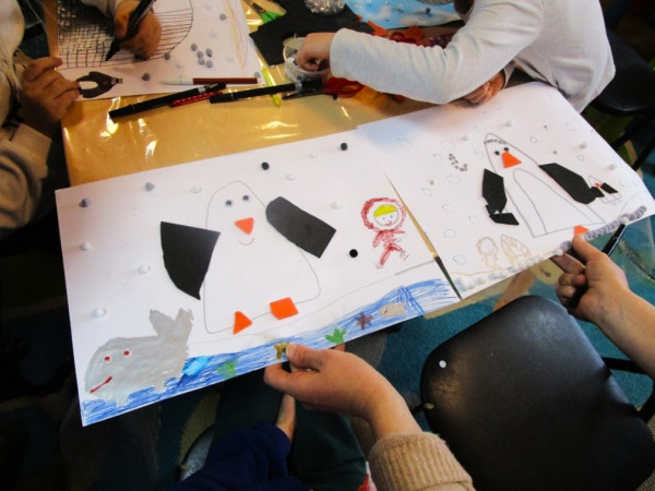 Dzieci tworzą prace plastyczne inspirując się książką o Antarktydzie