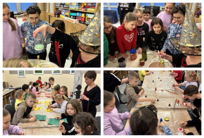 Kolaż zdjęć, a nich m.in. zajęcia tworzenia eliksirów inspirowane "Harrym Potterem"