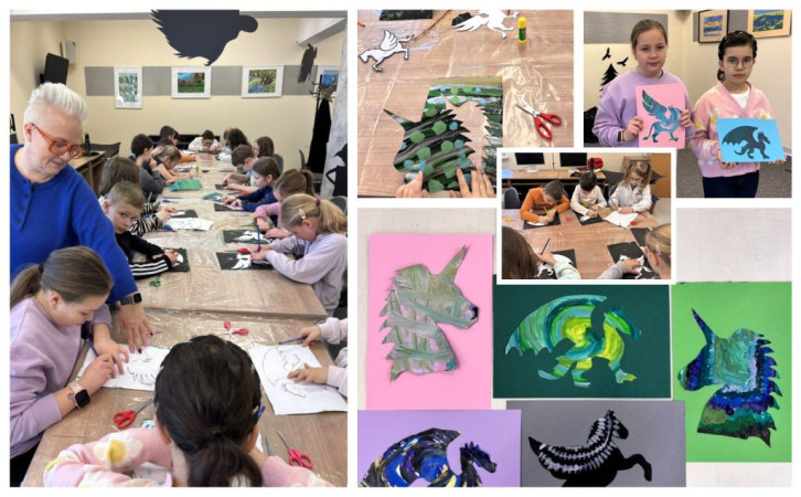 Kolaż zdjęć: dzieci tworzą prace inspirowane wizerunkami fantastycznych zwierząt