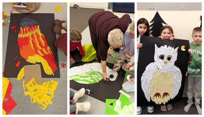 Kolaż zdjęć: praca w grupach nad obrazami-wyklejankami przedstawiającymi sowy