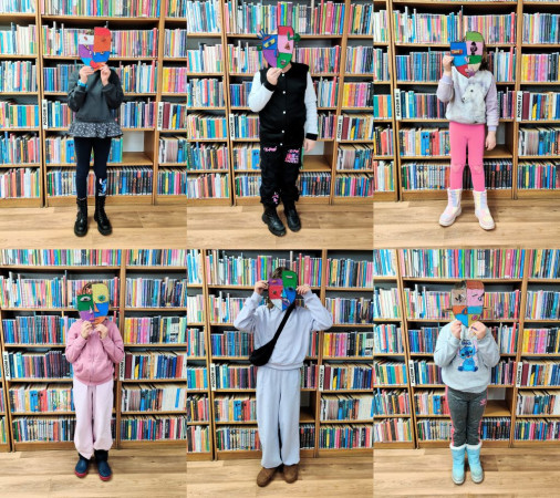 Dzieci pozują na tle bibliotecznych półek trzymając przy twarzach maski inspirowane kubizmem
