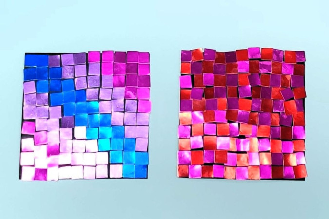 Na stole powstają kolorowe mozaiki z błyszczących minikwadratów