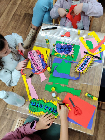 Dzieci tworzą przy stole graficzne wersje imion w konwencji pop art