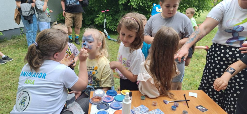 Jedną z największych atrakcji było malowanie twarzy – z powodu dużego zainteresowania na efekt trzeba było nieco poczekać, ale dzieci cierpliwie stały w kolejce. Dużą popularnością cieszyły się również brokatowe tatuaże. Wybór był imponujący: od małych, delikatnych gwiazdek, po większe, kolorowe motywy. Dzieciaki wybierały swoje ulubione wzory, a później z dumą prezentowały je na rękach i nogach. Animatorka prowadziła szereg dynamicznych gier i zabaw angażujących dzieci w różnym wieku, z niezwykłą energią potrafiła świetnie nawiązać kontakt z dziećmi, które chętnie uczestniczyły we wszystkich aktywnościach, śmiejąc się i rywalizując w przyjaznej atmosferze. Dla wszystkich preferujących spokojniejsze zajęcia przygotowano kącik czytelniczy, gdzie dzieci mogły w ciszy i spokoju przeglądać książki. Był też wybór gier planszowych – zarówno dla młodszych, jak i dla starszych dzieci. Przygotowany został również kącik labiryntów i kolorowanek. Nie można pominąć warsztatów robienia przypinek. Dzieci z pomocą bibliotekarza tworzyły własne, unikatowe przypinki, które chętnie nosiły przez całą imprezę. Zaprzyjaźniony żłobek „Mali Odkrywcy” włączył się do zabawy i przygotował balonowe upominki. Dzień Dziecka z biblioteką to był strzał w dziesiątkę!