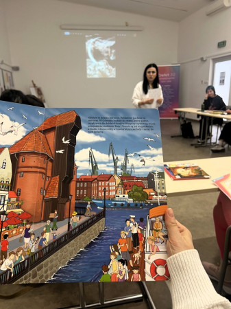 Na pierwszym planie ilustracja prezentująca Gdańsk, w tle trwające warsztaty