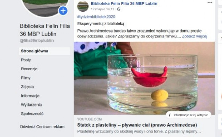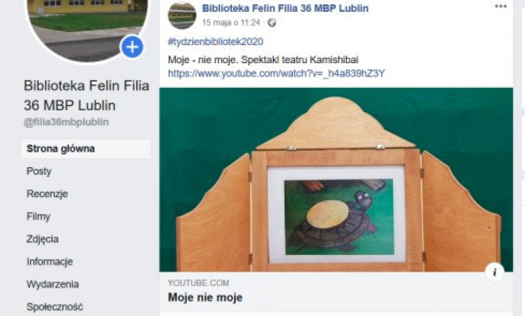 W ramach Tygodnia Bibliotek Filia nr 36 przygotowała propozycje dla trzech grup wiekowych. Dla najmłodszych były to „Poranki z bajką”. Codziennie prezentowaliśmy inną opowieść w formie teatrzyku kamishibai. Z nieco starszymi odkrywaliśmy tajemnice fizyki zachęcając przy tym do samodzielnych eksperymentów. W ten sposób uczciliśmy Rok Fizyki. Dorośli mogli wirtualnie obejrzeć wystawę „Jan Paweł II - sportowiec i turysta”, wpisującą w obchody Roku Świętego Jana Pawła II. Wszystkie działania filii są dostępne na stronie facebookowej filii.