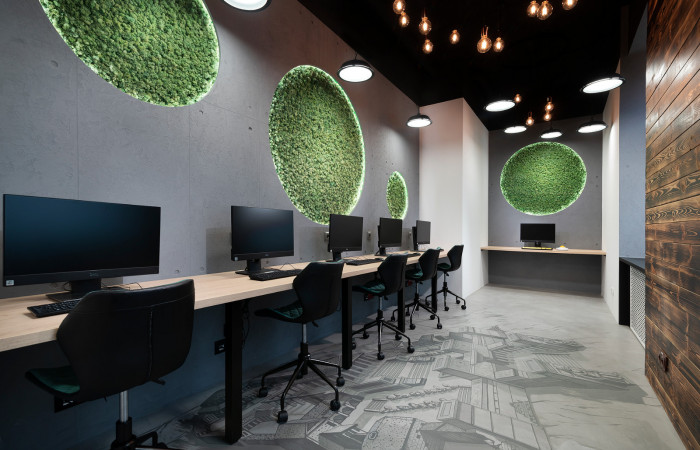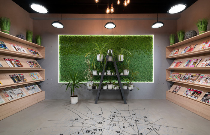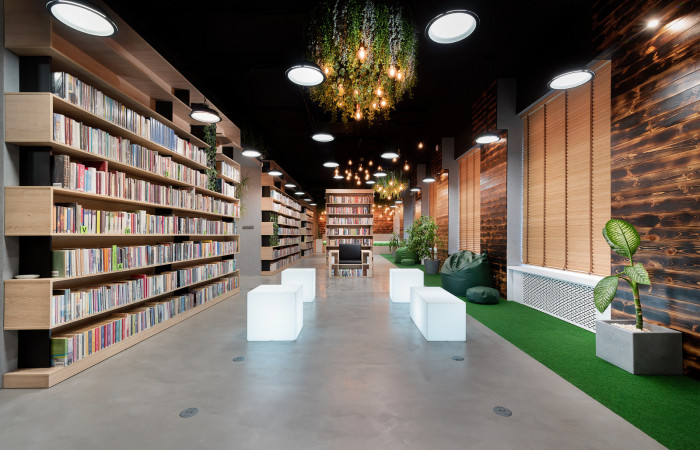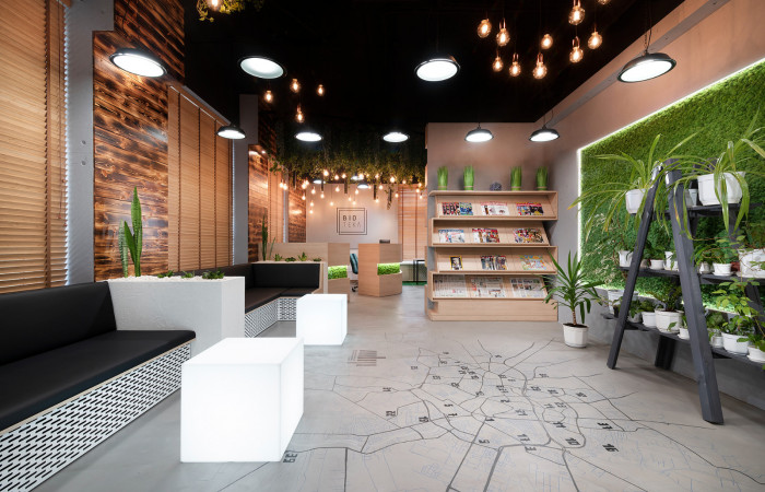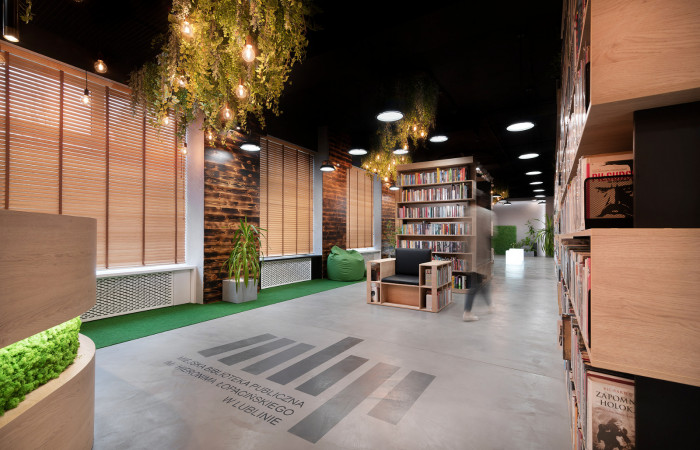 Wnętrze zostało zaprojektowane w najdrobniejszych detalach. Wszystko jest doskonale przemyślane i nie ma tutaj miejsca na przypadkowość. Połączenie surowych materiałów, takich jak beton czy szkło z elementami drewnianymi oraz wszechobecną zielenią tworzy harmonijną całość. Niezwykle istotny jest fakt, że Bioteka jest miejscem dostępnym dla wszystkich użytkowników, również tych z niepełnosprawnościami.