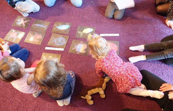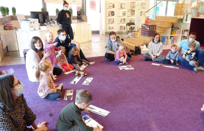 Na dywanie w kole siedzą dzieci i ich rodzice, przed nimi leżą książeczki obrazkowe